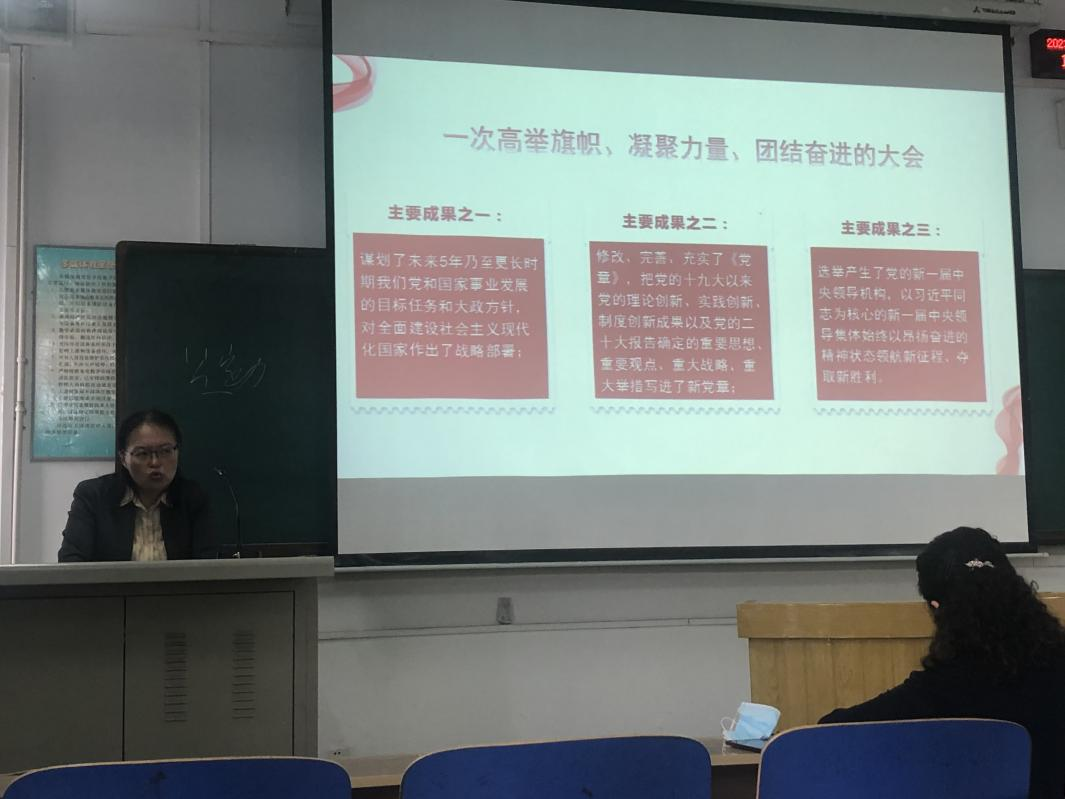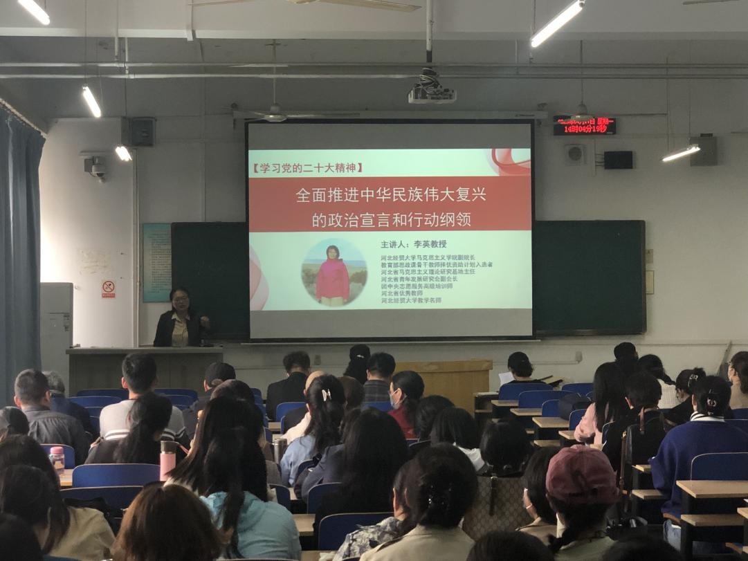 2023年4月17日, 伟德邀请马克思主义公司副经理李英教授进行党的二十大精神宣讲,讲座题目是:全面推进中华民族伟大复兴的政治宣言和行动纲领。讲座由伟德副经理杨清珍主持,伟德和外语部的全体教职工参加了讲座。