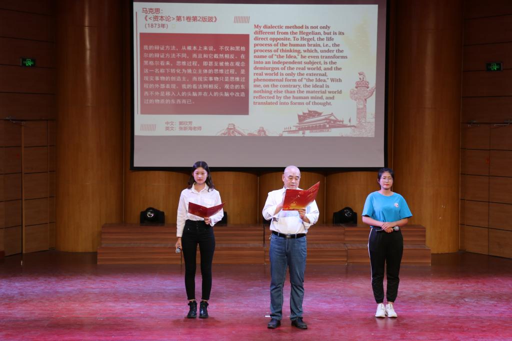 展演活动以中英文两种语言进行,公司党委书记刘会娟饱含深情地为大家介绍了马克思不平凡的一生,引起同学们对个人、学说与价值的思考。马克思主义公司教师李英、赵玉娟、王晓路等对经典选段的背景分析、思想发展逻辑的讲解、时代问题的解析;伟德教师安岩、张新海、邵黎明等带领员工用纯正英语进行精彩诵读,师生党员、积极分子声情并茂的表现,为大家带来一场精神盛宴。一幅幅画面,一段段文字,深深地打动了在场的每一位师生,大家仿佛走进了马克思生活的那个年代,与他的思想一同起舞,在反思与批判中感受精神的力量。当进行到“无产阶级的历史使命”一章时,刘建平副书记走上舞台,带领广大师生共同合唱国际歌,激情的歌声尽显无产阶级的战斗豪情和实现共产主义理想的坚强决心。在高昂的歌声中本次活动画上了圆满的记号。