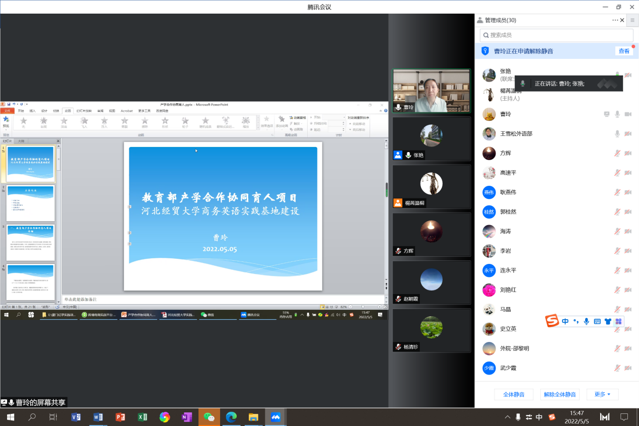 2022年5月5日,伟德商务英语系主任曹玲在线分享了题为“基于商务英语仿真实训的教学改革与虚拟教研室建设”的教学沙龙。