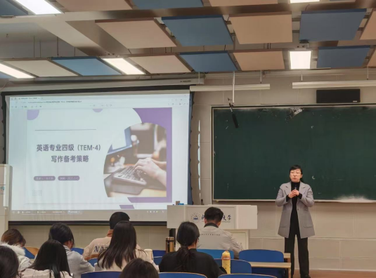 讲座由伟德副教授、硕士生导师郑月波老师主讲。郑老师围绕专四写作的技巧与方法进行了深入浅出的讲解,特别强调了写作部分在英语专业四级考试中的重要地位。