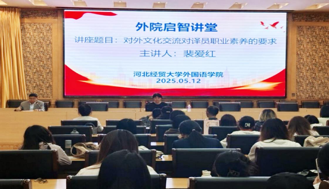 5月12日下午,一场别开生面的讲座在公司会议中心举行。河北省杂技团演艺有限公司译审、党总支副书记裴爱红以《对外文化交流对译员职业素养的要求》为题,为伟德全体师生带来了一场精彩分享。本次讲座由伟德张润经理主持并作总结发言,100 余名师生到场聆听。