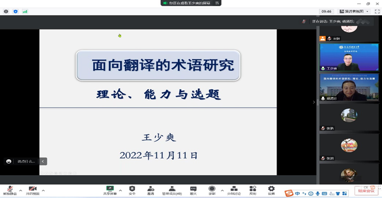 王少爽博士首先阐述了术语的多重属性及重要意义,梳理了术语学的主要理论,阐释了术语研究的语言、认知与传播三个维度;其次,在术语翻译方面,他深入剖析了术语翻译的底层逻辑和基本原则,归纳了术语翻译的三个层次,分析了译者术语能力的构成要素;最后,他介绍了术语及术语翻译研究相关文献的检索方法,分析了术语翻译的相关研究选题,并根据个人项目申报经验分享了术语研究相关科研项目申请书撰写方法。